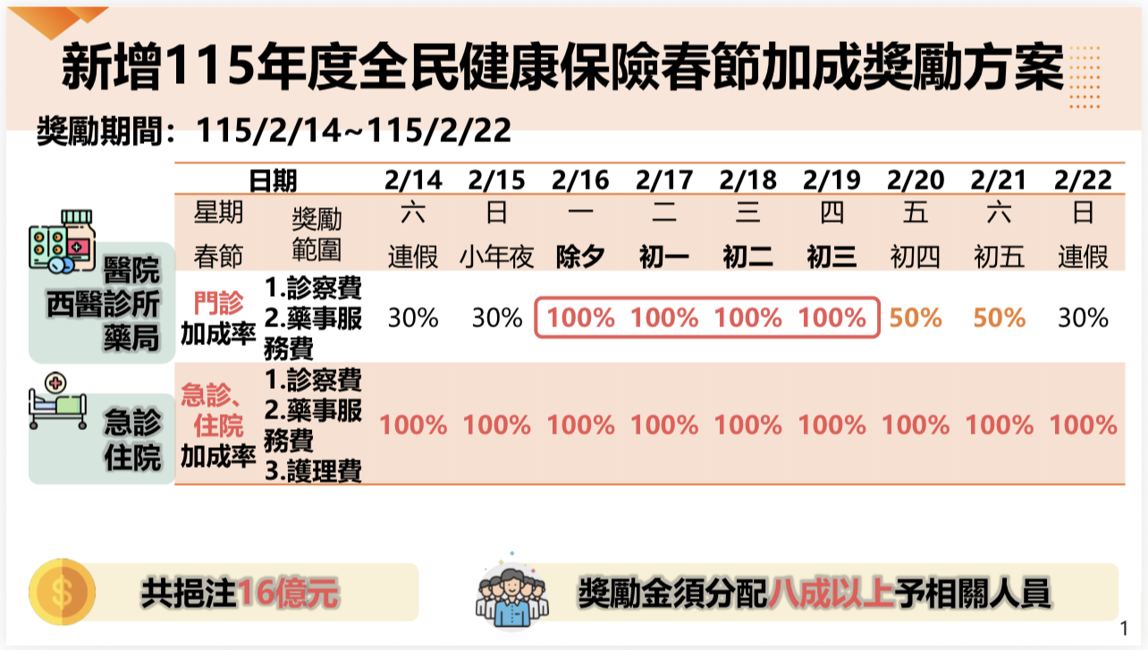 為確保115年春節連假期間( 115/2/14至2/22 ) 醫療照護服務不中斷,健保署提供醫療院所加成獎勵措施(額外預算16億):