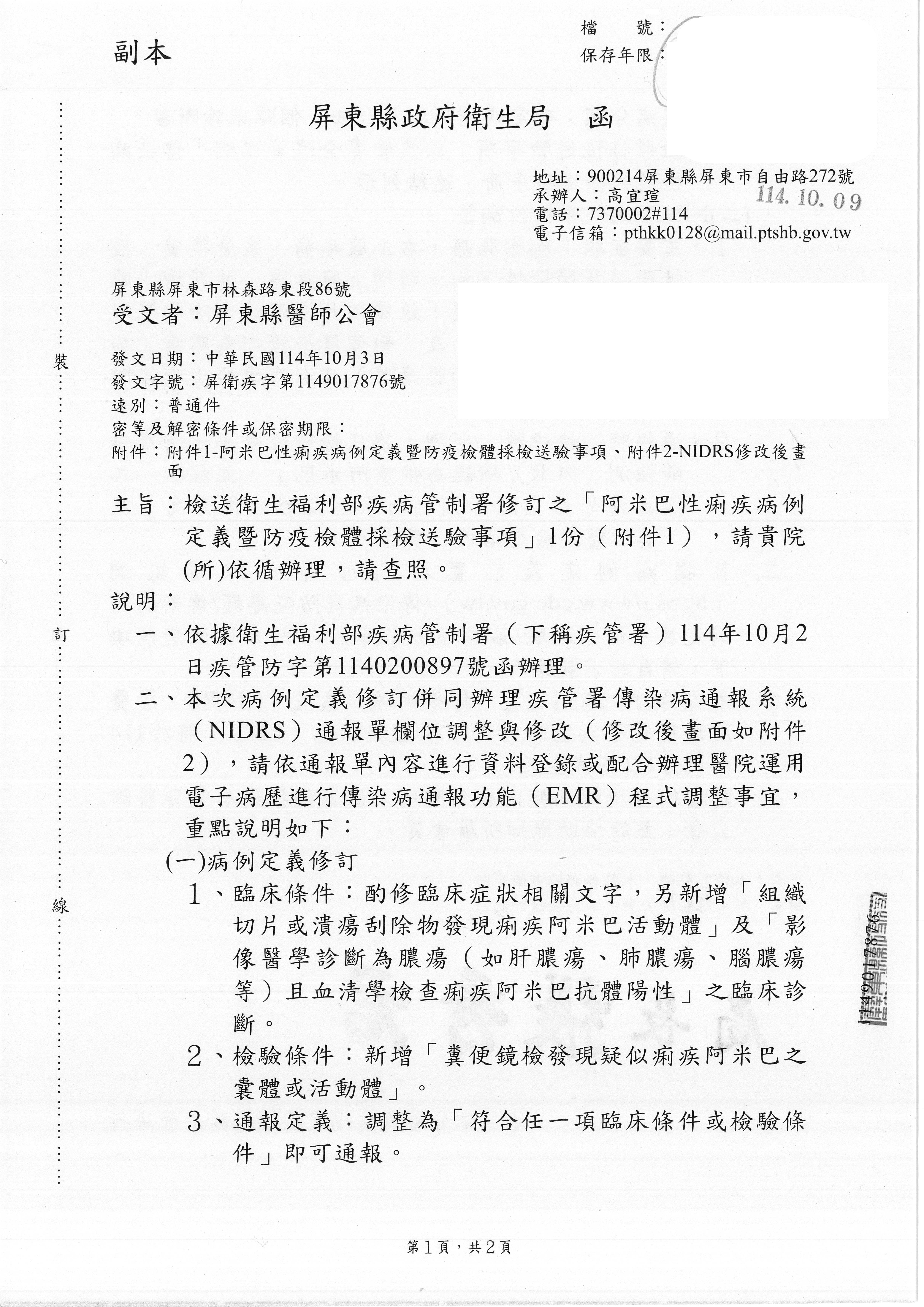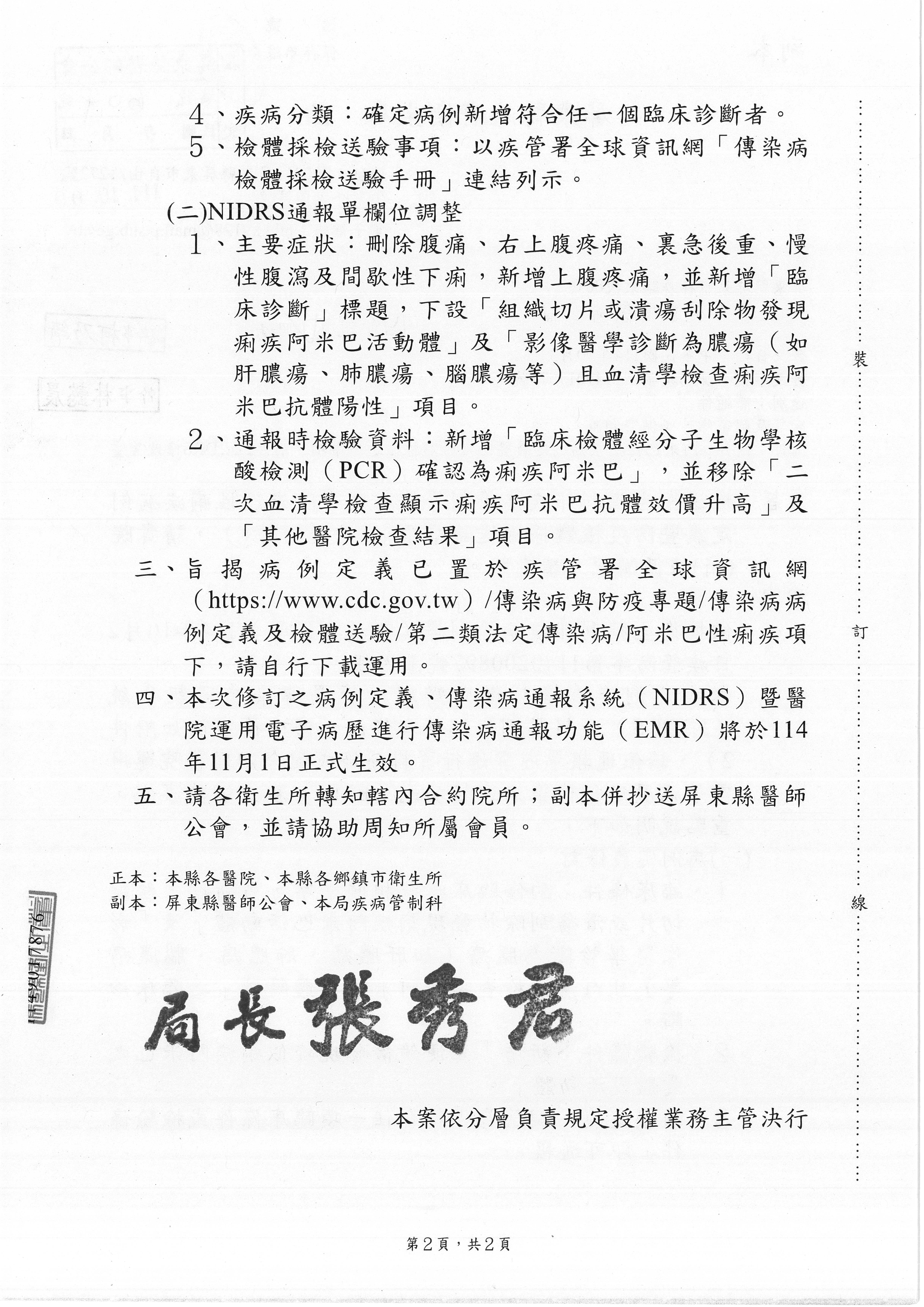 疾管署修訂之「阿米巴性痢疾病例定義暨防疫檢體採檢送驗事項」