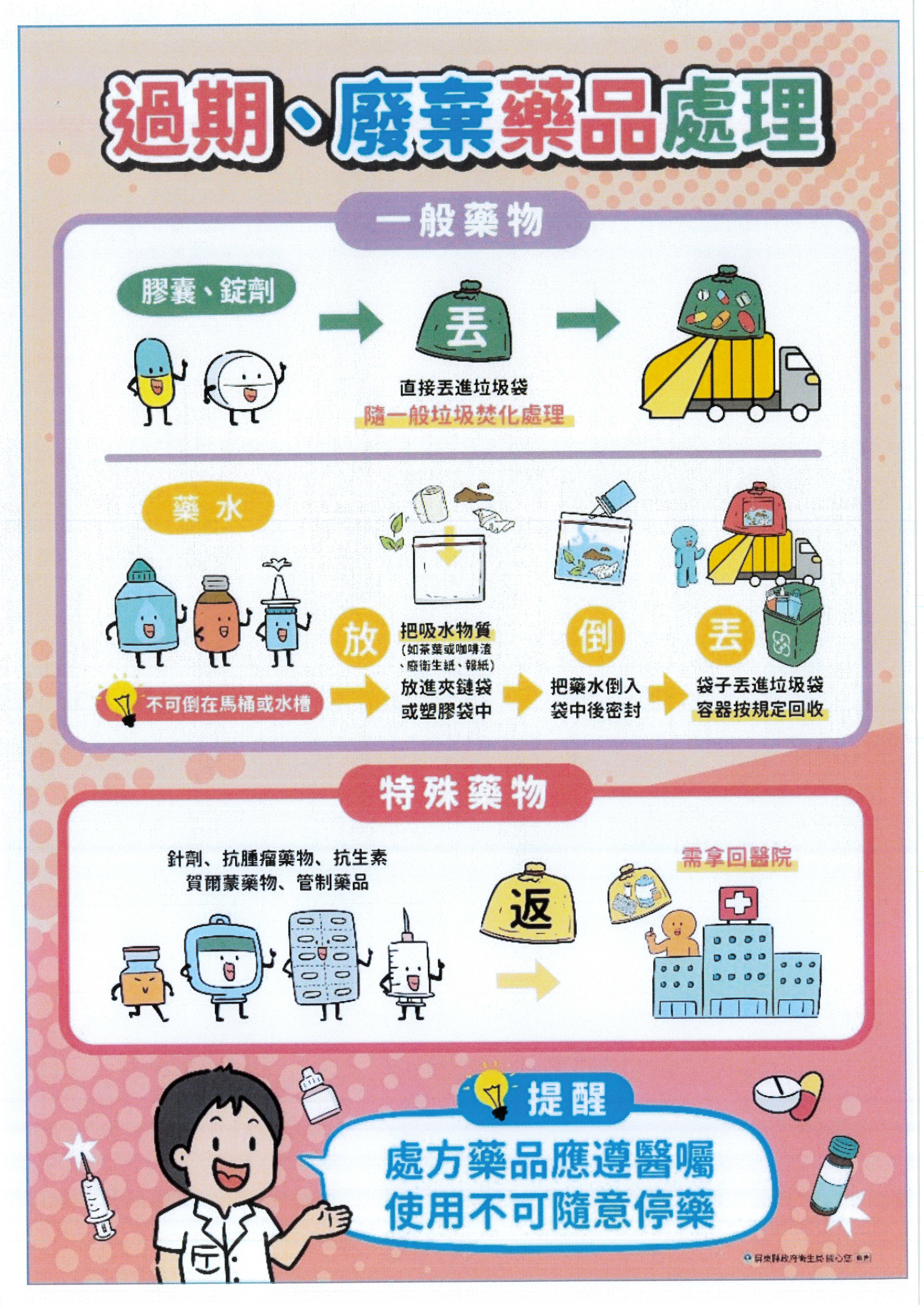 檢附「過期、廢棄藥品處理」衛教單張供參。